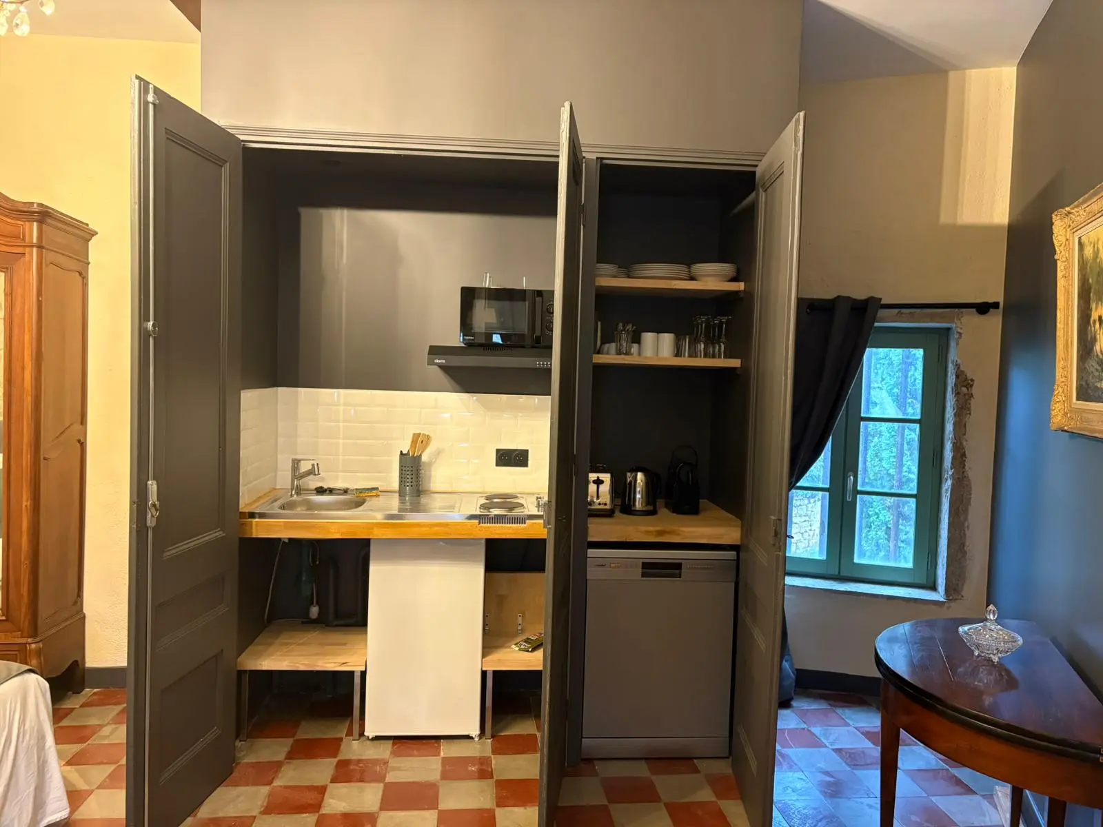 - Cuisine équipée avec four, réfrigérateur, lave-vaisselle…