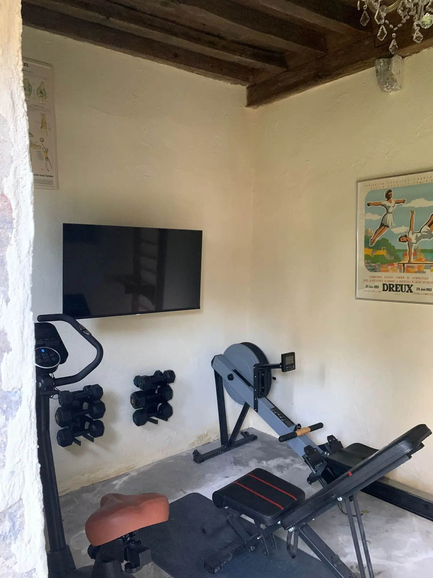 - Salle dotée des basics (vélo d'intérieur, poids, rameur, tapis, barres murales)